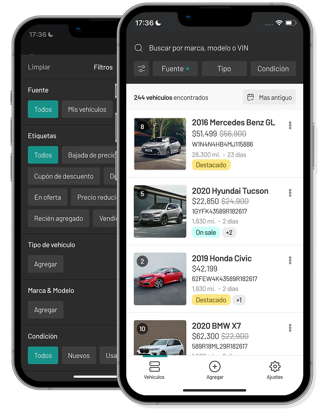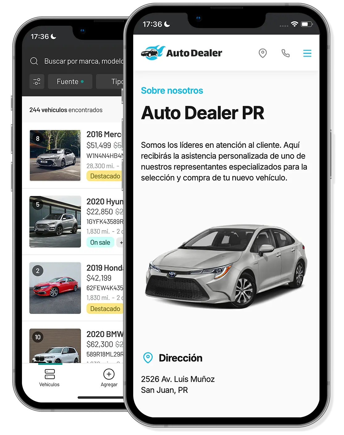 Optimiza la gestión del inventario desde cualquier lugar con una aplicación móvil diseñada para facilitar el día a día de los concesionarios. Actualiza precios e imágenes en tiempo real, captura leads de manera profesional y sin complicaciones, y mantén el control de tu stock las 24/7. Todo desde la palma de tu mano.
